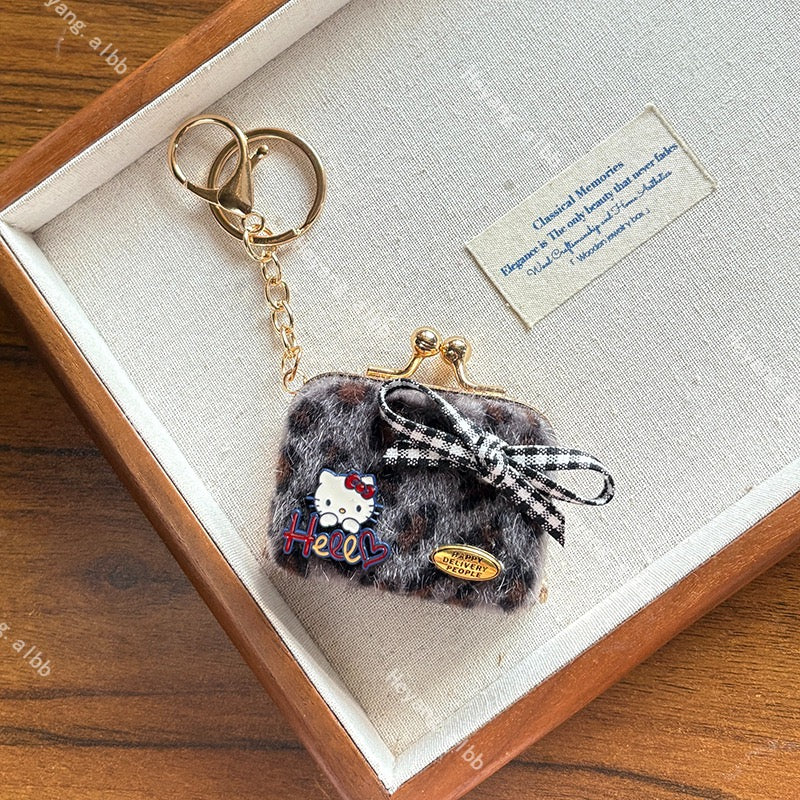 This adorable Hello Kitty mini coin purse keychain combines cozy furry texture with a playful leopard print, adding a fun, retro-inspired touch to your everyday carry. It features a detailed Hello Kitty emblem, embossed lettering, and a charming checkered bow for a whimsical, eye-catching look. The compact kiss-lock closure design is perfect for storing small essentials like coins, lip balm, or tiny trinkets, while the sturdy keyring allows you to attach it to your bag, keys, or backpack. With a soft, plush finish and a playful "Happy Everyday People" accent, it combines practicality with irresistible charm—ideal for Hello Kitty fans and anyone looking to add a cute, cozy touch to their style.